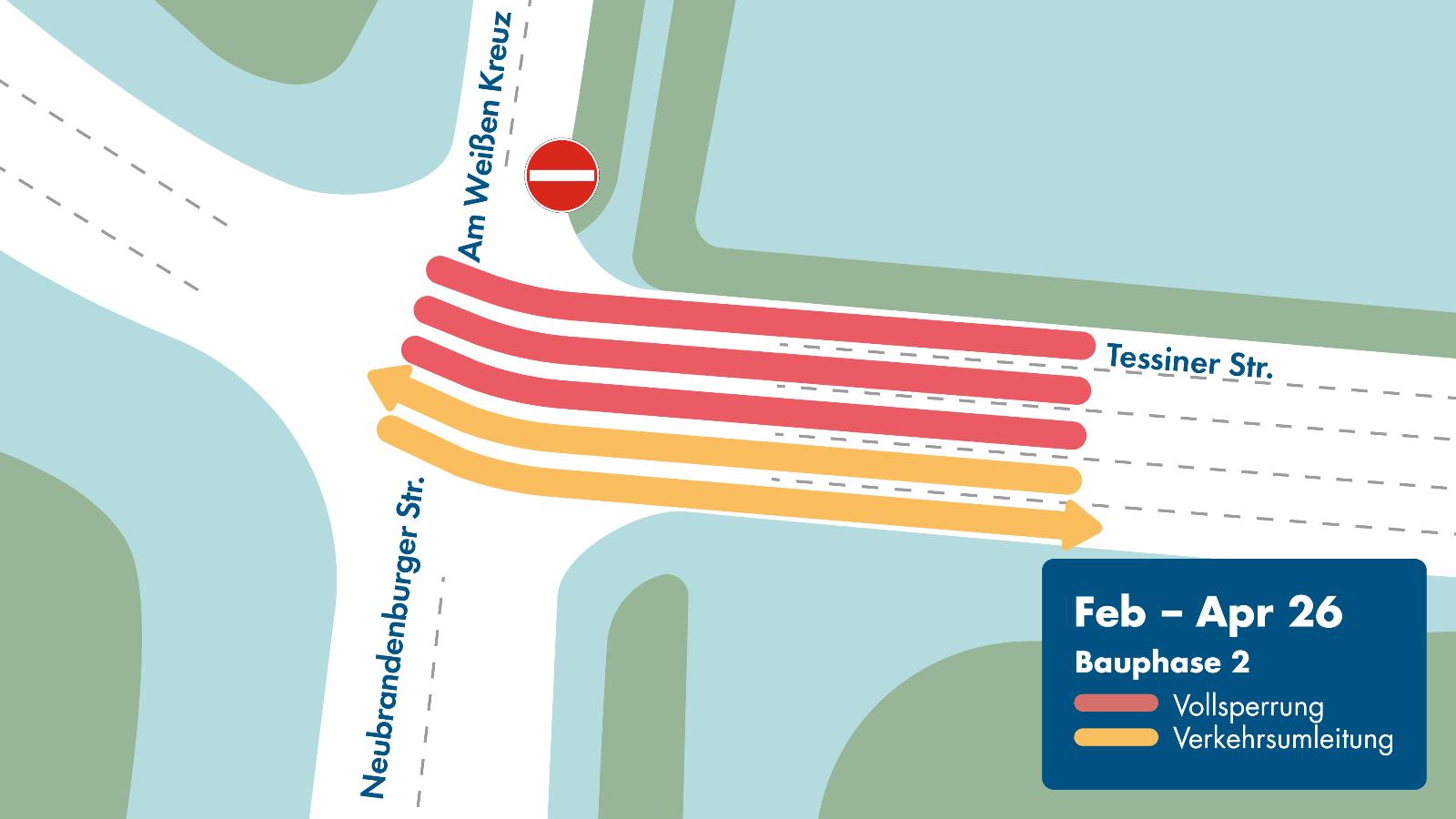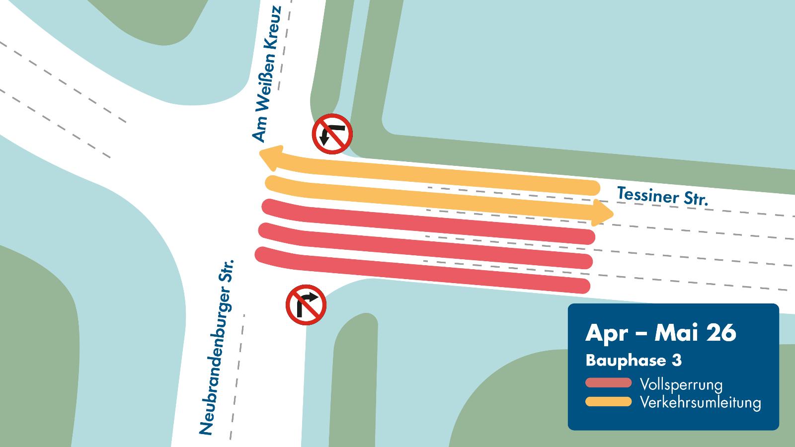 - Wegfall der Linksabbiegespur von der Tessiner Straße in die Neubrandenburger Straße